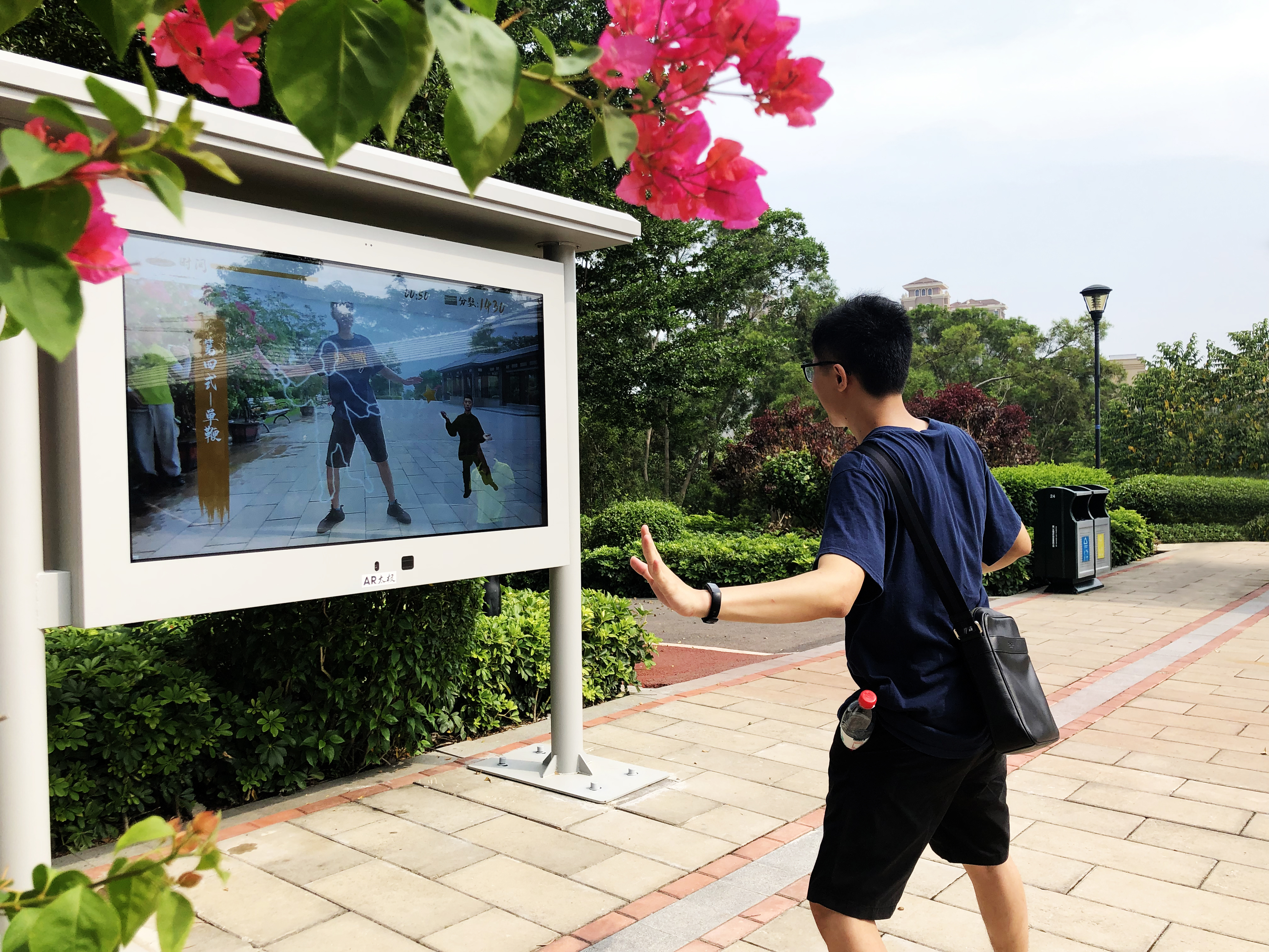 通过把太极拳/或广场舞和AR技术、AI技术相结合,在公园设置一块人工智能AI大屏,屏幕中会有太极大师教锻炼者打太极,同时屏幕还会“检验”锻炼者的学习情况:实时捕捉锻炼者全身的关节点,将锻炼者的动作与太极大师的动作比较并给出评判。